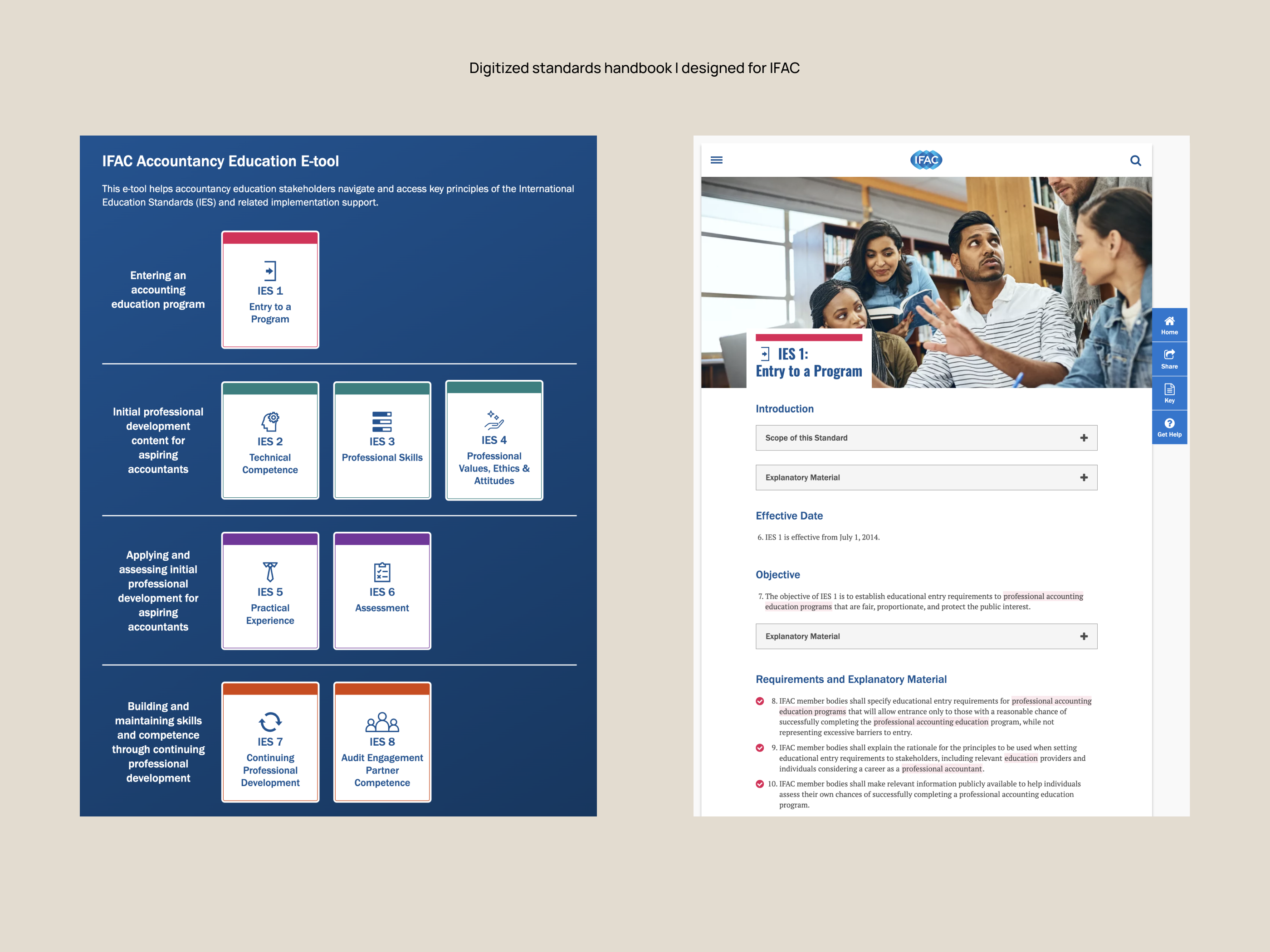 Using the design system we created for IFAC as a starting point, I worked with the International Accounting Education Standards Board to digitize their standards handbook. I wireframed and visually designed all the additional components to make this product come together: https://education.ifac.org/index.html